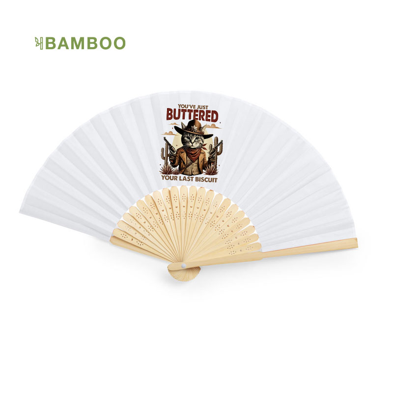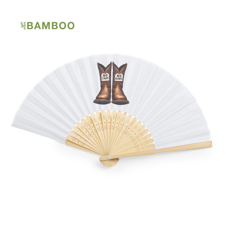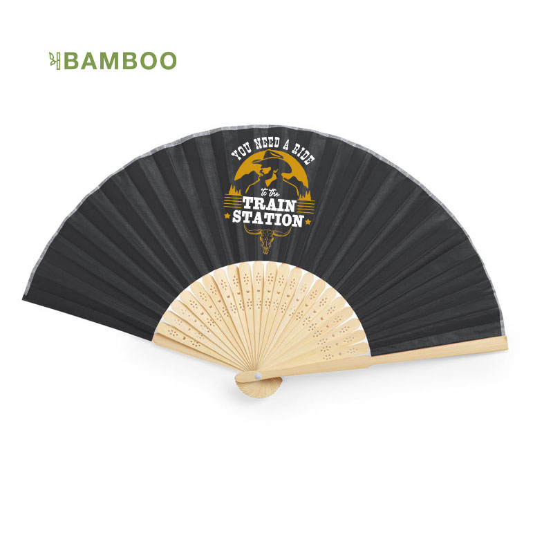 Abanico de línea nature con tela en resistente poliéster 190T. Varillas fabricadas en flexible bambú. Disponible en blanco y en negro.